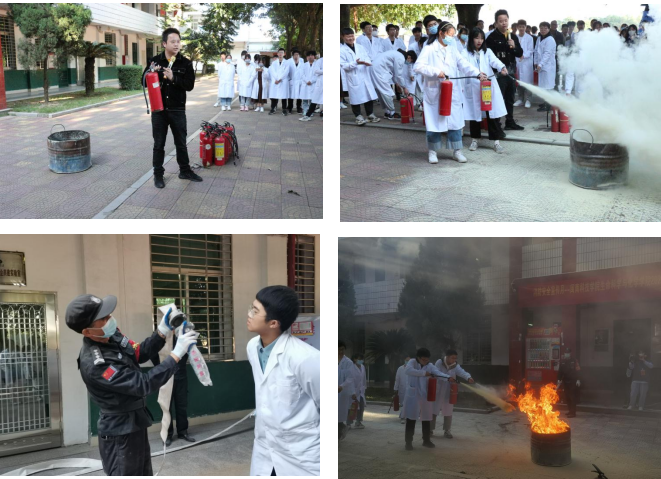 本次消防演练共设置打翻点燃的酒精灯不慎引发火情的应急处置模拟演练场景、灭火器灭火毯及消防栓灭火演练、实验室火灾应急处置视频教育学习等三个环节。