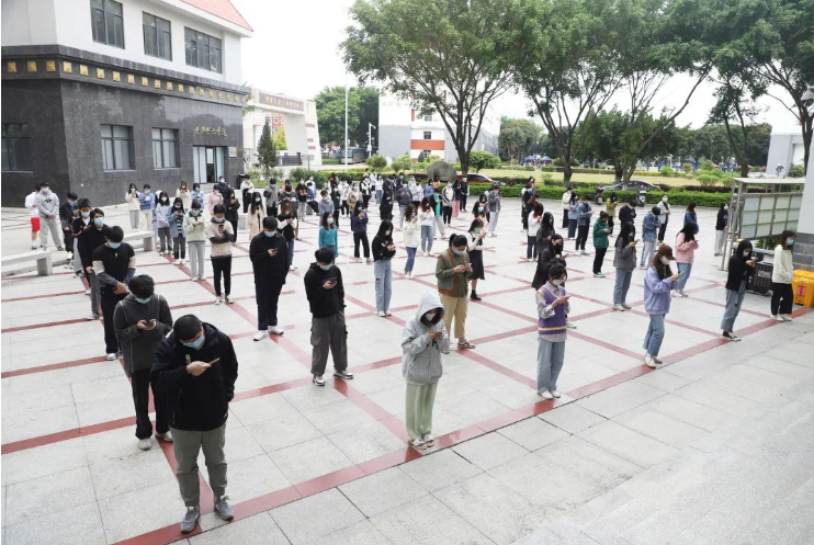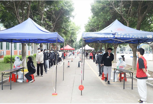 核酸检测现场秩序井然,快速高效。广大师生自觉佩戴口罩,间隔一米排队,通过体温检测、信息采集,十人一组便捷地完成核酸采样,并有序离开采样区,最大程度的做到了避免人员聚集和有效分流。