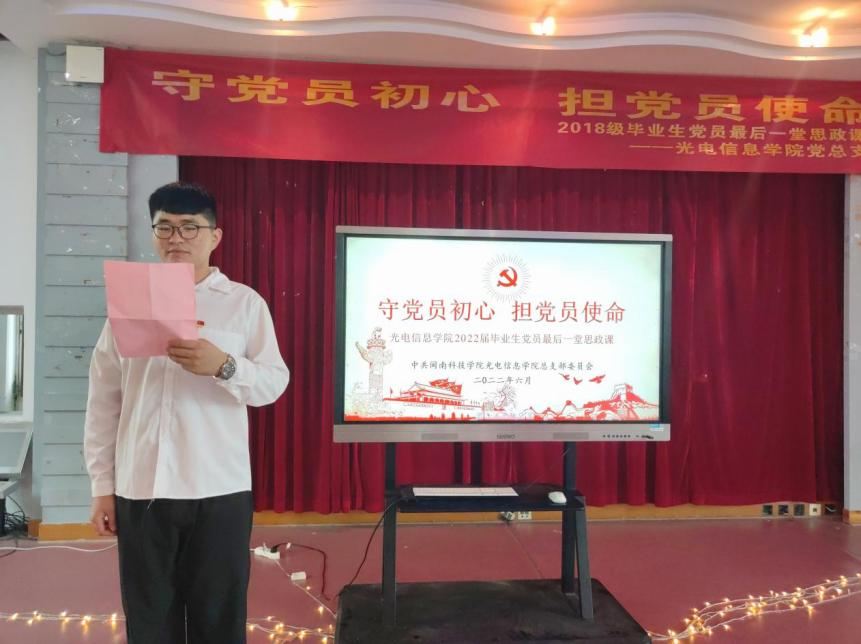 为教育引导毕业生党员在奔赴人生新征程的道路中不忘初心,在今后的工作岗位上砥砺奋进,6月15日,光电信息学院党总支组织开展毕业生党员“五个一”主题思政课。