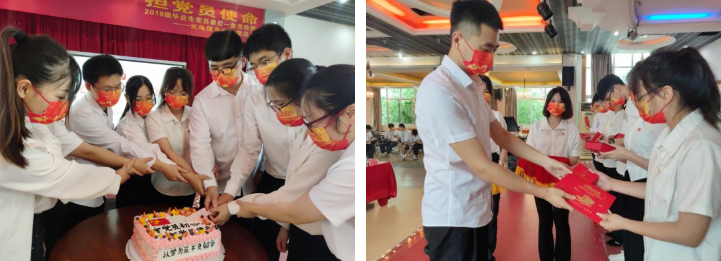 重温一遍入党誓词。党总支书记李毅任和毕业班支部书记黄玉玲为毕业生党员们佩戴党员徽章,毕业班党员同志为新进党员佩戴党员徽章,之后,党总支书记李毅任领誓,全体毕业生党员面对党旗宣誓,重温入党誓词。教育应道毕业生党员不忘身为共产党员的职责,永葆共产党人的政治底色。