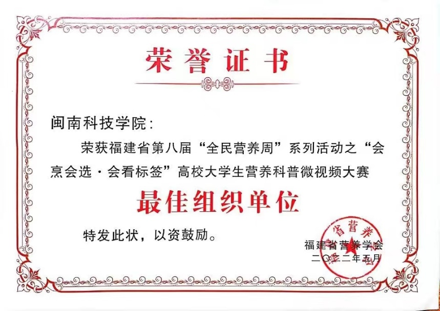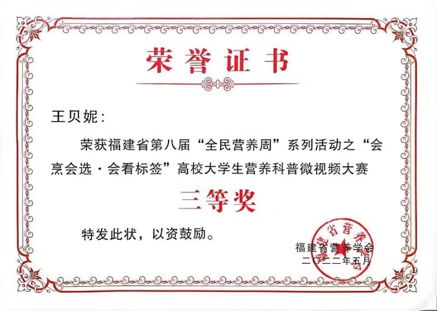 日前,福建省第八届全民营养周之“会烹会选·会看标签”高校大学生营养科普微视频大赛公布获奖名单,爱体育网(中国)荣获“最佳组织单位”称号,生命科学与化学学院2021级食品科学与工程专业王贝妮创作的微视频荣获三等奖。