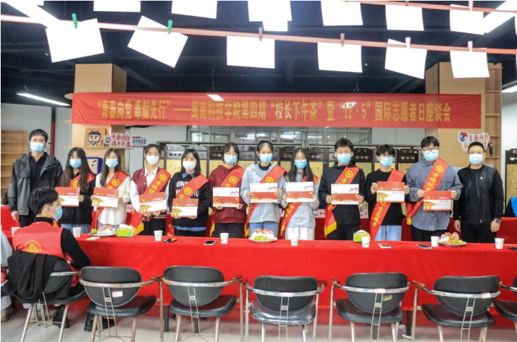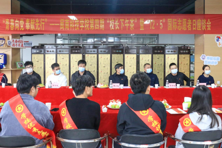 12月2日下午,校团委举办第四期“校长下午茶”暨“12.5”国际志愿者日座谈会,校长游小波、校党委副书记林树生,学生工作处、校团委班子及青年志愿者代表参加活动。
