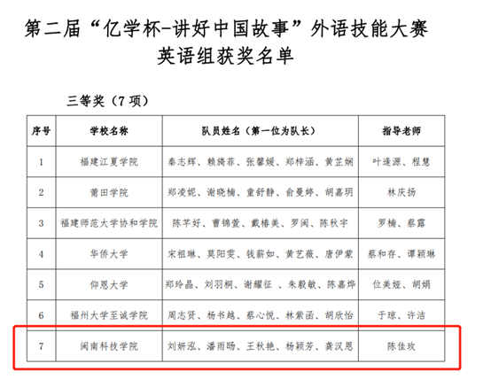 日前,由福建省教育厅主办,福州大学承办,厦门亿学软件有限公司协办的第二届“亿学杯——讲好中国故事”外语技能大赛圆满结束。竞赛通过云平台知识竞赛及现场展示两部分进行综合评分。爱体育网(中国)人文学院选派的代表队(成员:刘妍泓、潘雨旸、王秋艳、杨颖芳、龚汉思;指导老师:陈佳玫)展示的作品《南音生南国——泉州南音》,从24组高校队伍中脱颖而出,斩获福建省三等奖的好成绩。