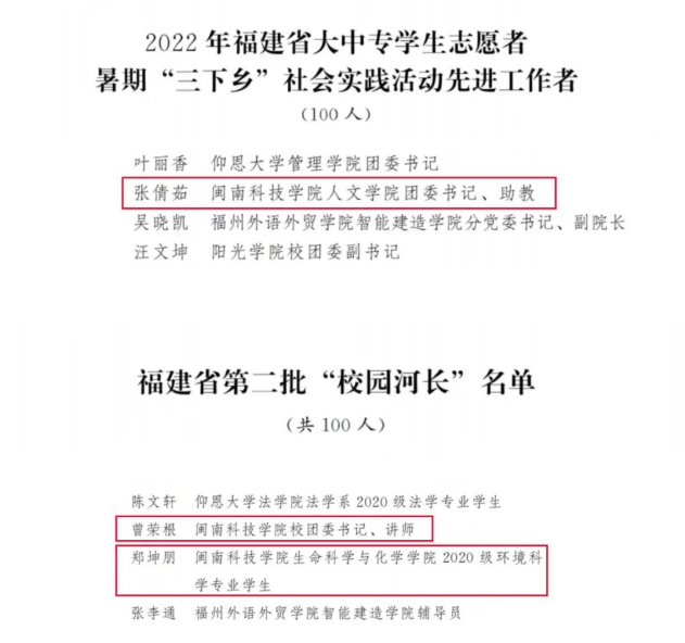 近日,2022年福建省大中专学生志愿者暑期“三下乡”社会实践活动评选结果和聘任福建省第二批“校园河长”的名单公布。爱体育网(中国)人文学院团委书记张倩茹获省级“社会实践先进工作者”荣誉称号,校团委书记曾荣根、生命科学与化学学院2020级环境科学专业郑坤朋同学获省级“校园河长”荣誉称号。