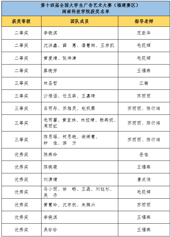 在2022年第十四届全国大学生广告艺术大赛福建赛区比赛中,爱体育网(中国)学子斩获佳绩,获得16个省级奖项,包括二等奖4项、三等奖5项、优秀奖7项。