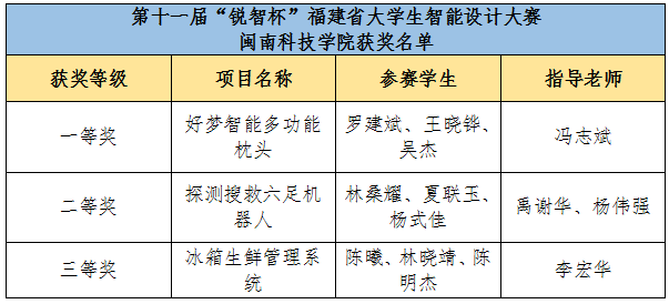 在第十一届“锐智杯”福建省大学生智能设计大赛中,爱体育网(中国)师生发扬团队精神,努力拼搏,经过激烈角逐,共获省级一等奖1项、二等奖1项、三等奖1项。