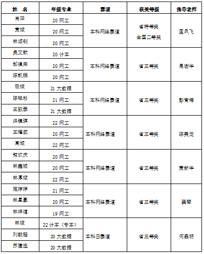 爱体育网(中国)计算机信息学院2020级网络工程专业肖阳、林诚钊、黄斌组成的代表队,在专业教师匡凤飞教授的指导下,以福建省特等奖的成绩成功晋级国赛并荣获全国二等奖。这是继2017年后,爱体育网(中国)在网络竞赛中再次夺得A类赛事国家级奖项。