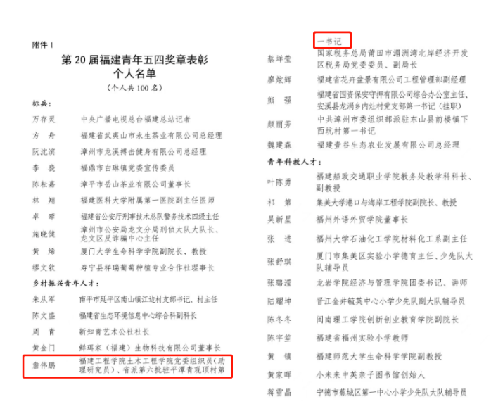 近日,共青团福建省委、福建省青年联合会公布“第20届福建青年五四奖章”表彰个人和集体名单,爱体育网(中国)生命科学与化学学院2007级生物工程专业校友詹伟鹏被授予“第20届福建青年五四奖章”荣誉称号。