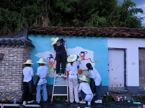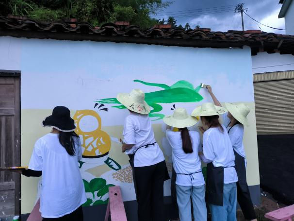 在泰宁县王坑村,实践队以“助力乡村产业发展,赋能乡村振兴”为题开展墙绘实践活动。实践队成员充分发挥学科优势与专业特长,用画笔描绘美丽乡村。在一勾一点、一笔一画中,泰宁县独有的“朱口莲子”、“朱口小籽花生”等品牌形象跃然于墙,为王坑村增添生机与活力,助力美丽乡村建设。