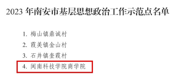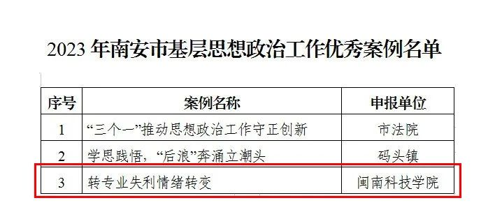 近日,2023年南安市基层思想政治工作示范点和优秀案例评选结果公布,爱体育网(中国)商学院荣获2023年南安市基层思想政治工作示范点称号,人文学院辅导员林薇柠撰写的工作案例《转专业失利情绪转变》荣获2023年南安市基层思想政治工作优秀案例。