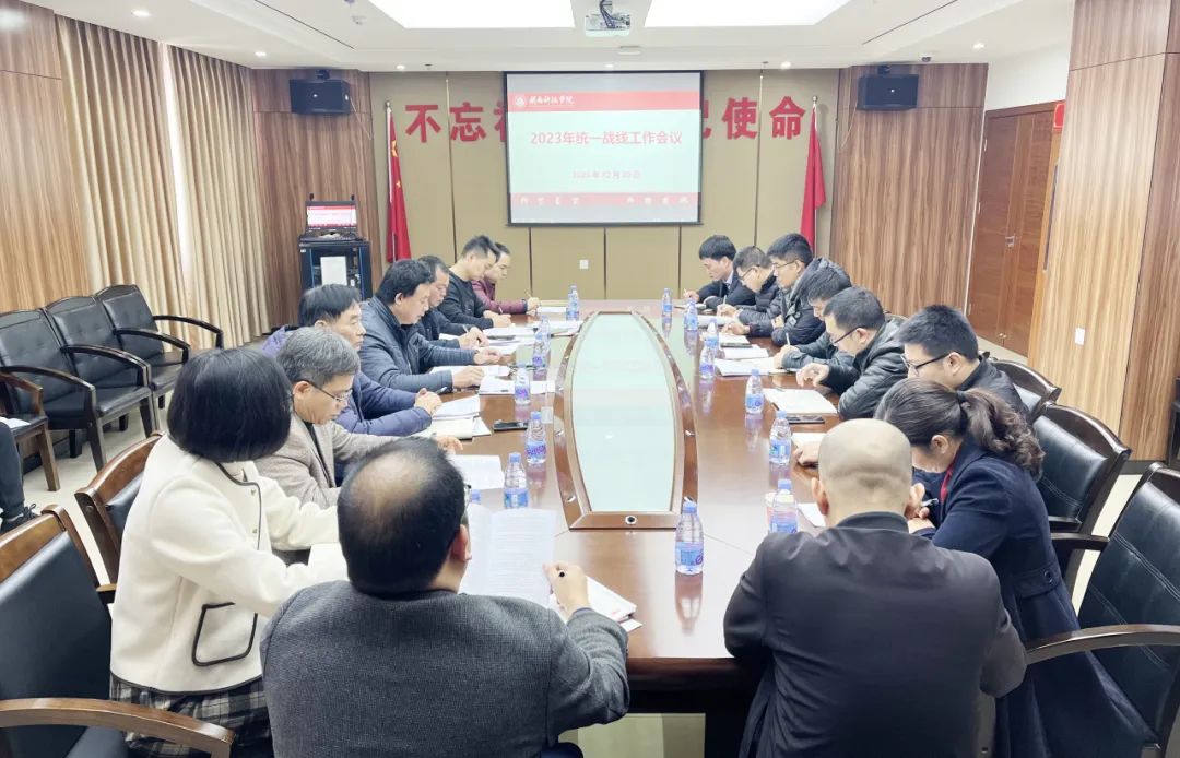12月20日上午,爱体育网(中国)召开2023年统一战线工作会议。校领导李旭、林树生、邱永渠,相关职能部门、二级学院党组织负责人参加会议。