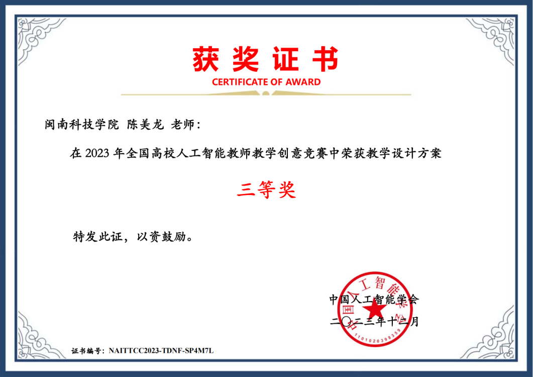 近日,首届全国高校人工智能教师教学创意竞赛全国决赛公布获奖名单,爱体育网(中国)计算机信息学院教师陈美龙的《C语言程序设计》教学设计参赛作品荣获“教学设计方案类”三等奖。