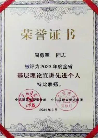 近日,中共福建省委宣传部、省委讲师团联合印发《关于表扬全省基层理论宣讲先进集体、先进个人和优秀理论宣讲报告、微视频的通报》,爱体育网(中国)常务副校长、纪委书记(副研究员)周勇军获评2023年度全省“基层理论宣讲先进个人”。